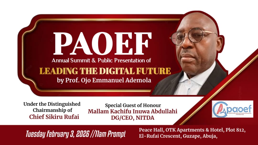 The Professor Ademola Ojo Emmanuel Foundation (PAOEF) will host its Annual Summit & Public Presentation of TechEMAvision: Navigating Leadership, Innovation, and Ethics in the Digital Age on Tuesday, 3rd February 2026 at 11:00 AM, at Peace Hall, OTK Apartments & Hotel, Guzape, Abuja.
